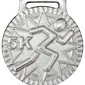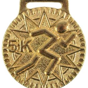 Medalla para carreras de distancia de 5K, de metal y con la figura de un corredor, es de una medida de 4cm de diámetro; al reverso se personaliza con una imagen impresa a color.