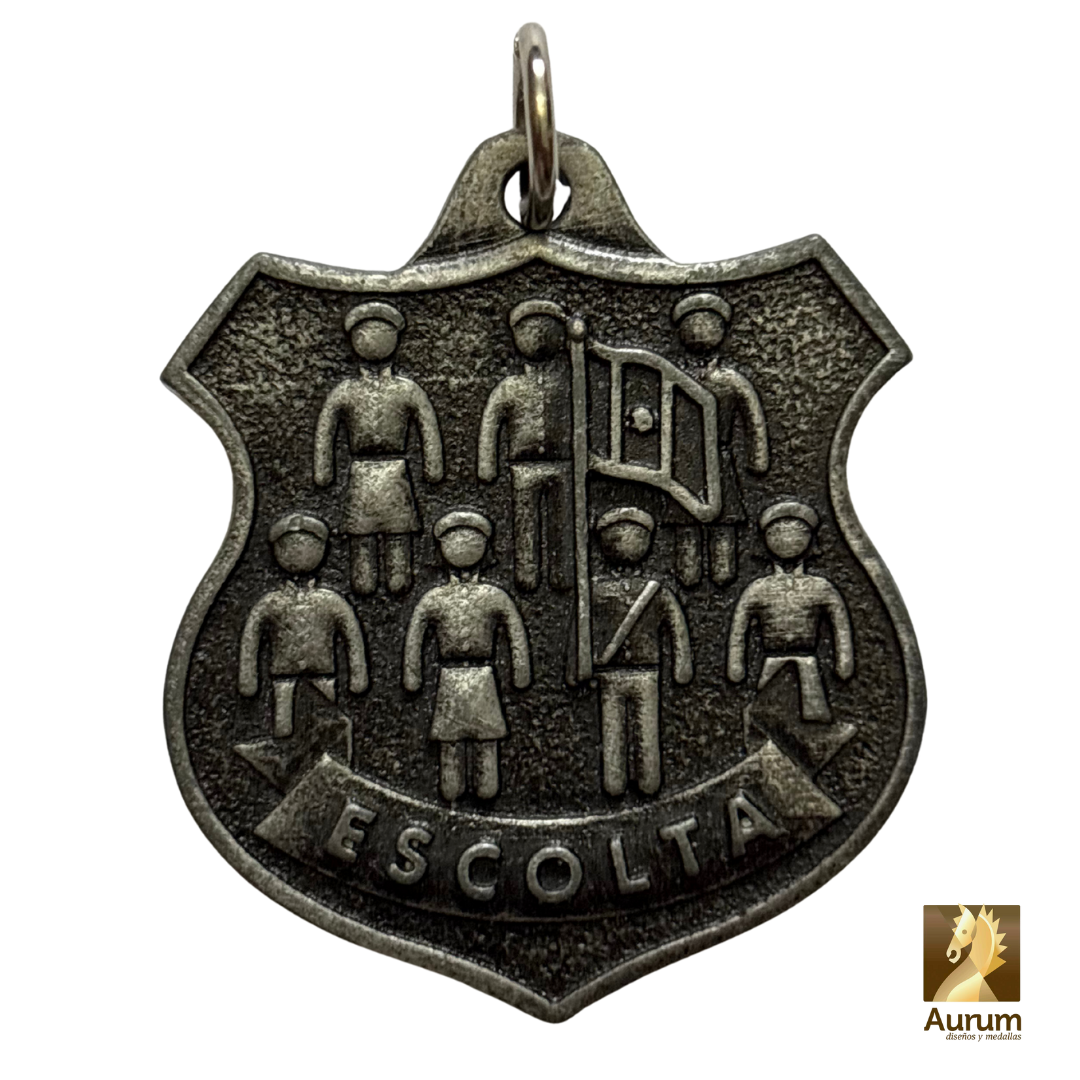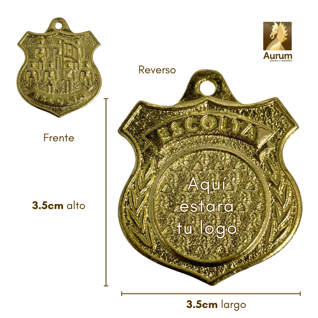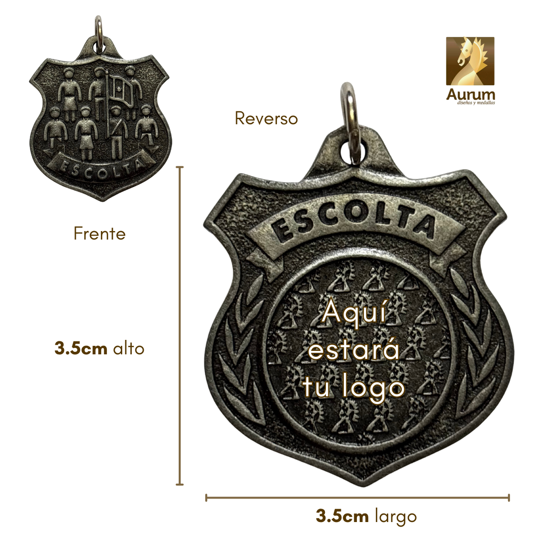 La medalla de premiación de Escolta visualiza las figuras de alumnos formando la escolta escolar. Es para premiar concursos de esta categoría o bien, por el logro de pertener a la escolta de la escuela.