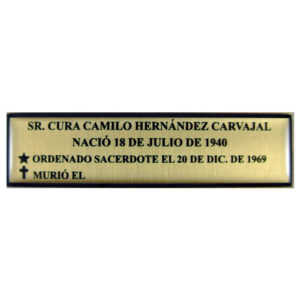 La placa personalizada con nombre, es elaborada en metal, en aluminio o latón. Lleva el texto que nos indiques, el nombre de la persona o de la familia, también puede incluir el año de nacimiento y defunción, así como una imagen como un cruz o una virgen o santo(a).