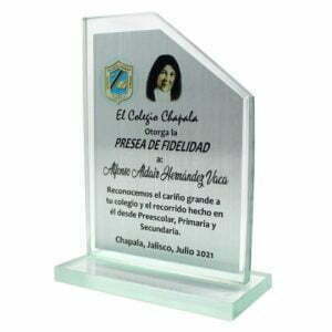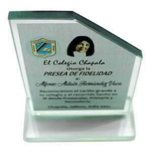 Es una pieza de un reconocimiento en cristal personalizable en forma de rectángulo en posición vertical. Tiene la esquina superior derecha en diagonal como “cortada“, a fin de mostrar una apariencia estética..